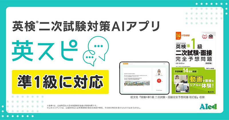 アイード株式会社(窪田優希代表取締役、東京都新宿区)は、英検®二次試験対策アプリ「英スピ」において、2025年9月に準1級に対応予定だ。