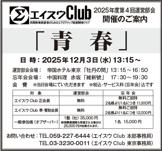 エイスウClub 2025年度第4回運営部会開催のご案内「青春」 2025-12-01 日時: 2025年12月3日(水)13:15~ 運営部会会場: 帝国ホテル東京 「牡丹の間」13:15~16:50 懇親会会場: 中国料理 赤坂「維新號」17:30~19:30 会費 ※当日会場にていただきます ※税込・サービス料(懇親会)込です お問い合わせ:TEL.059-227-6444(エイスウ Club 本部事務局) TEL.03-3230-0011(エイスウ Club 東京事務局) << 前のページへ戻る