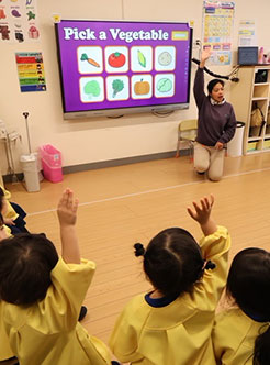 さらに驚いたのは、年長の英語クラスだ。太陽系の惑星に関するクイズを、ネイティブの先生がシャワーのように英語で話しかける。それに対して子どもたちは臆することなく、手を挙げ、きれいな発音で答える。これまで積み上げてきた英語教育の成果が、見事に子どもたちに結実していることを実感した。