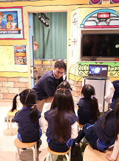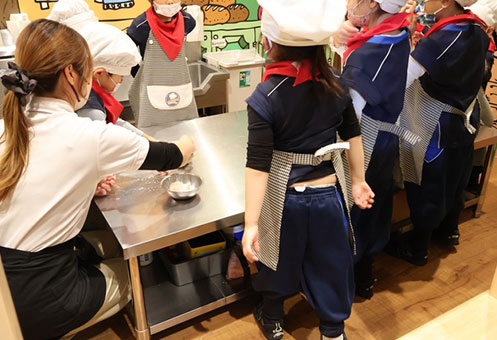 ラーニングステーションでは、ベーカリーやピザのデリバリーショップ、放送局に分かれて、年中の子どもたちが職業体験に取り組んでいた。ベーカリーでは本物の生地をこねて焼き上げる。放送局ではニュースのキャスターになりきって、英語でニュースを読み上げ番組を制作。子ども向けの体験ながら、リアリティを追求しているのにも驚いた。