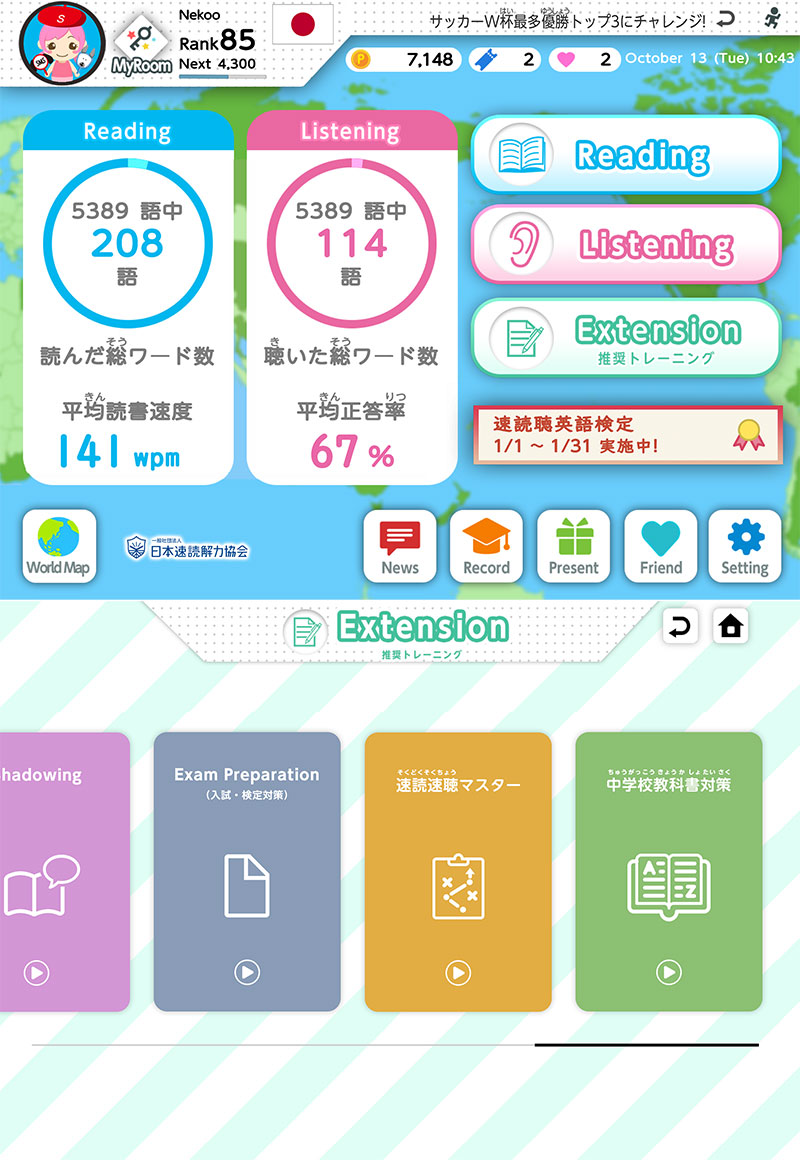 導入塾の中には速読聴英語講座を必修にしている塾もあるが、オプション講座として実施している塾が多い。自宅受講で週2回、3回というケースもあるが、全体的には週1回がほとんどだ。通常授業の前後にタブレットを渡し、生徒が各自で取り組むスタイル。比較的規模の大きな教室では生徒が同時に取り組み、チューターが巡回する形式をとる教室もあるが、基本設計は生徒の自立学習を前提としている。