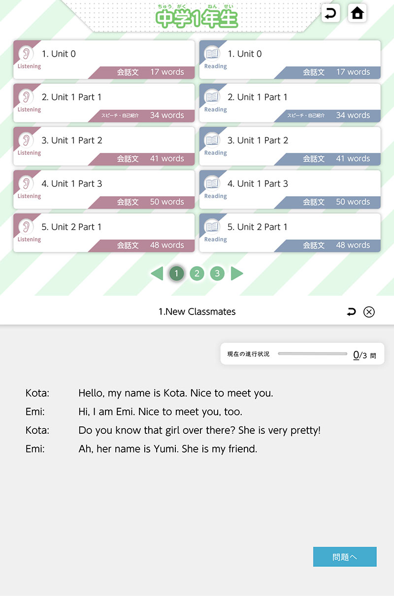 この4月からは、速読聴英語講座の「中学校教科書対策」に「Sunshine」(開隆堂出版)が追加搭載された。従来の「NEW HORIZON」(東京書籍)、「Here We Go!」(光村図書)を合わせると、全国の中学校教科書の採用カバー率は約80%。一部、著作権の関係で使用できないものもあるが、教科書の本文と音声の9割超が搭載されている。掲載文を元にした演習問題は同社がオリジナルで作成したもの。学校のワークとは異なる演習問題に取り組むことにより、さまざまな角度からその本文を理解してもらえるようにという配慮からだ。定期テスト対策としての活用はもちろん、予習として活用する場合は、塾で先取りした内容が学校では復習となる好循環も期待できる。教材は自由に活用できるため、苦手な生徒が長期休暇中などに総復習として使うという方法もある。