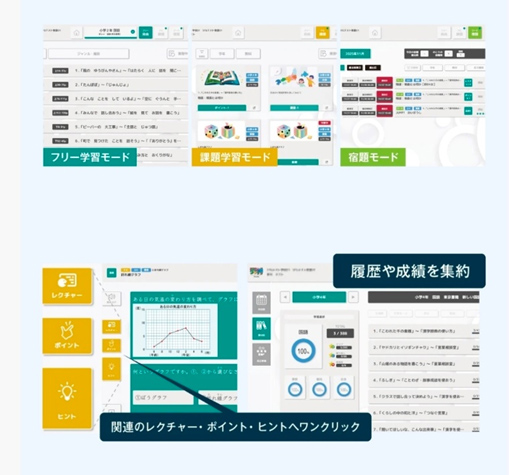 教科書の内容そのままに、生徒が自身のペースで学習を進める「フリー学習モード」、先生が設定した学習リストに沿って学習を進める「課題学習モード」、「宿題モード」を搭載。不登校支援や、フリースクールでの利用等、学ぶ場の制約を受けずに、教室と家庭でのシームレスな学びを実現。生徒主体の学習を支援します。